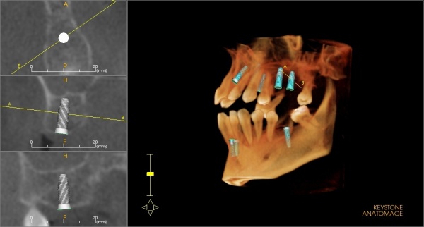 W celu precyzyjnego zaplanowania zabiegu implantologicznego wykonujemy trójwymiarową (3D) wizualizację planowanego leczenia implantologicznego w programie DTX Studio Implant, polegającą na wirtualnym wszczepieniu implantów, a następnie stworzeniu precyzyjnego szablonu implantologicznego. Procedura ta pozwala na idealne umiejscowienie implantów, tak aby osiągnąć jak najlepszy efekt estetyczny i kliniczny. Planowanie 3D wykonywane jest w oparciu o badanie tomografii komputerowej CBCT, które jest wykonywane na miejscu w naszej Pracowni Tomografii Komputerowej CBCT.